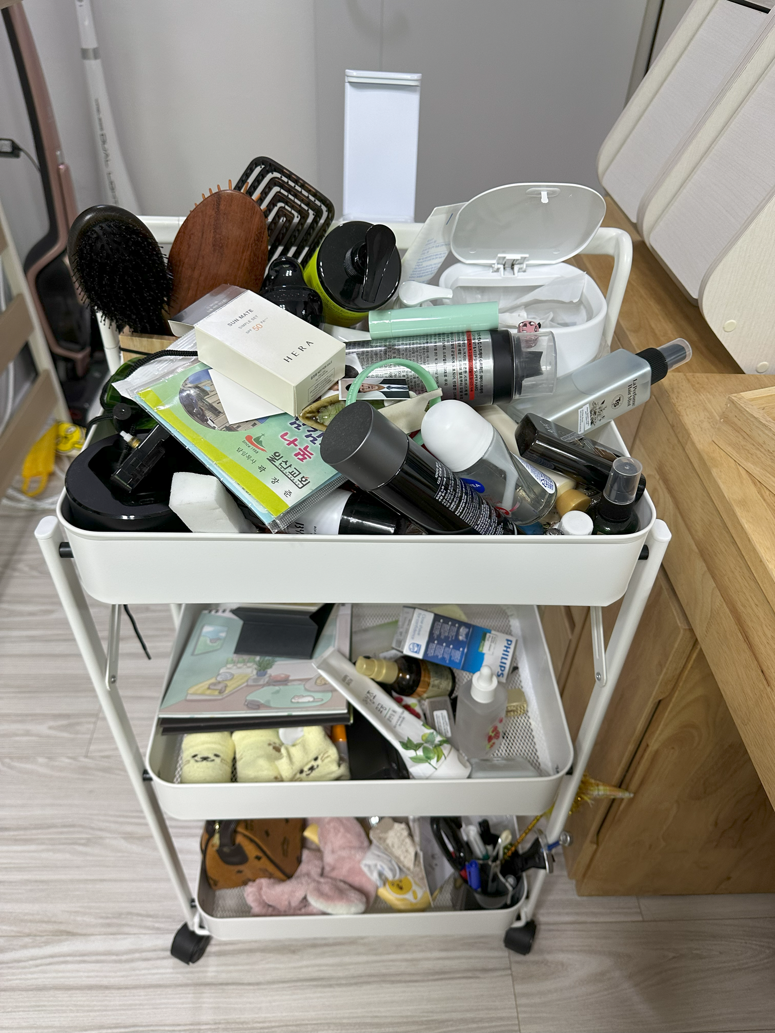 저는 정리정돈을 할 때 일단 짐을 한군데로 싹 꺼냅니다. 이렇게 하면 모아놓은 짐들을 제자리에 정리할 지, 버릴 지, 아니면 다른 장소에 놔둘 지 결정하기 편해져요. 트롤리는 제가 허리를 다치고 세탁바구니처럼 쓰려고 산 건데 이렇게 임시 보관 선반으로 쓰니 아주 유용하네요. 트롤리 리뷰는 나중에 따로 하려고 합니다.