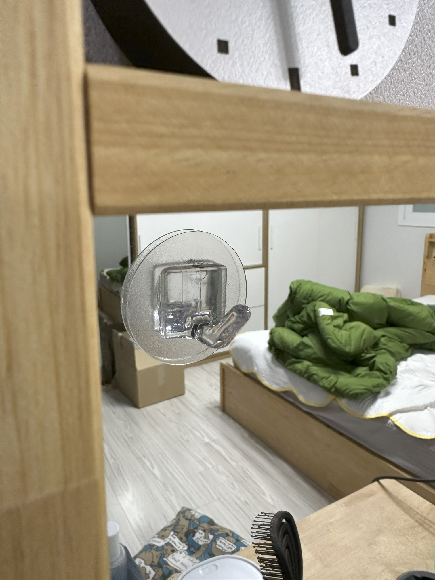 거울에 붙인 후크에 세면대도 걸어뒀어요. 이제 아침마다 찾아다닐 필요가 없겠네요.