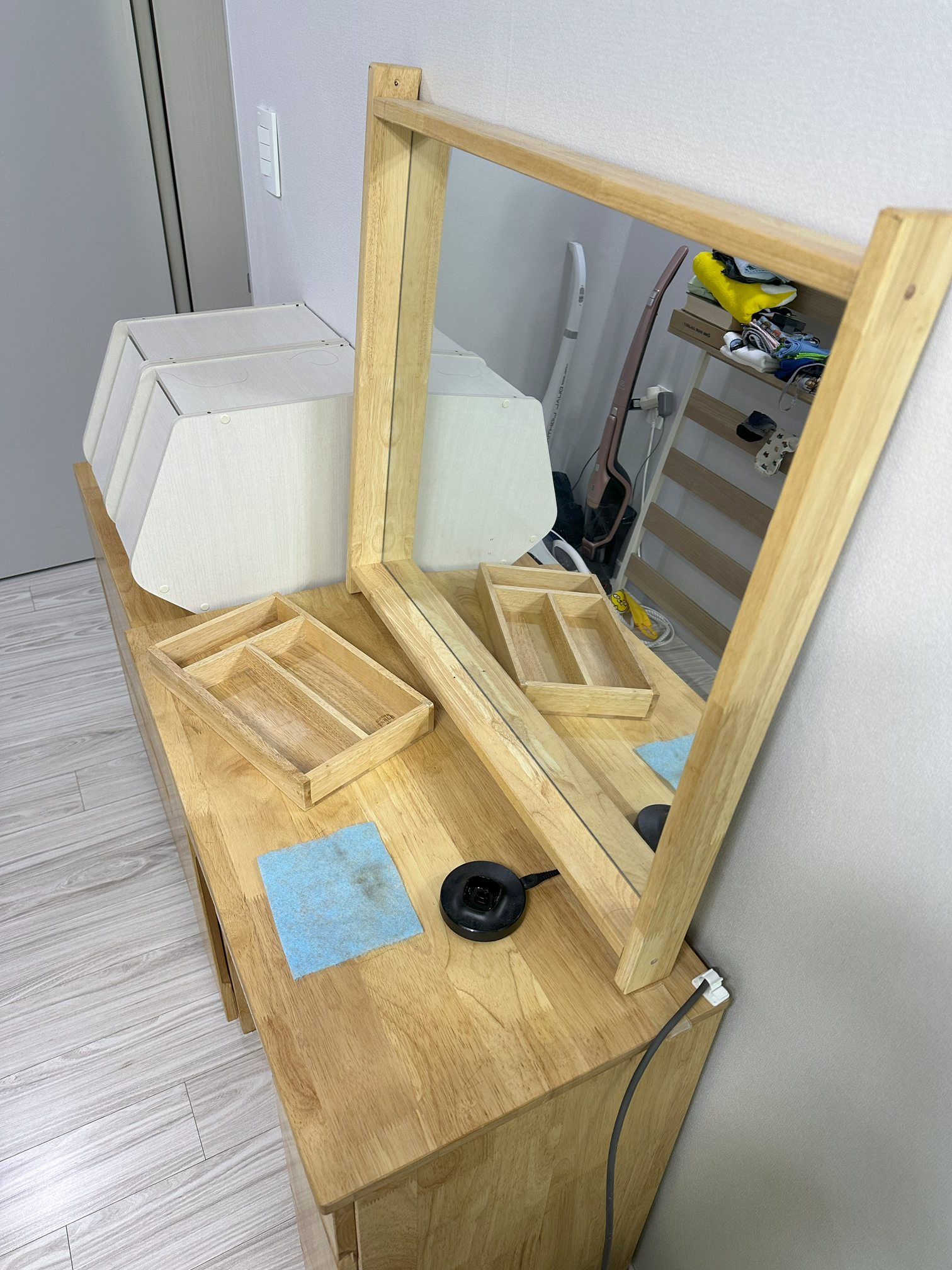 화장대 위의 물기가 자연건조 되는 동안 거울을 닦아 다시 올렸습니다. 거울에 자꾸 제 후줄근한 모습이 비쳐서 거울 청소 과정은 생략하겠습니다.