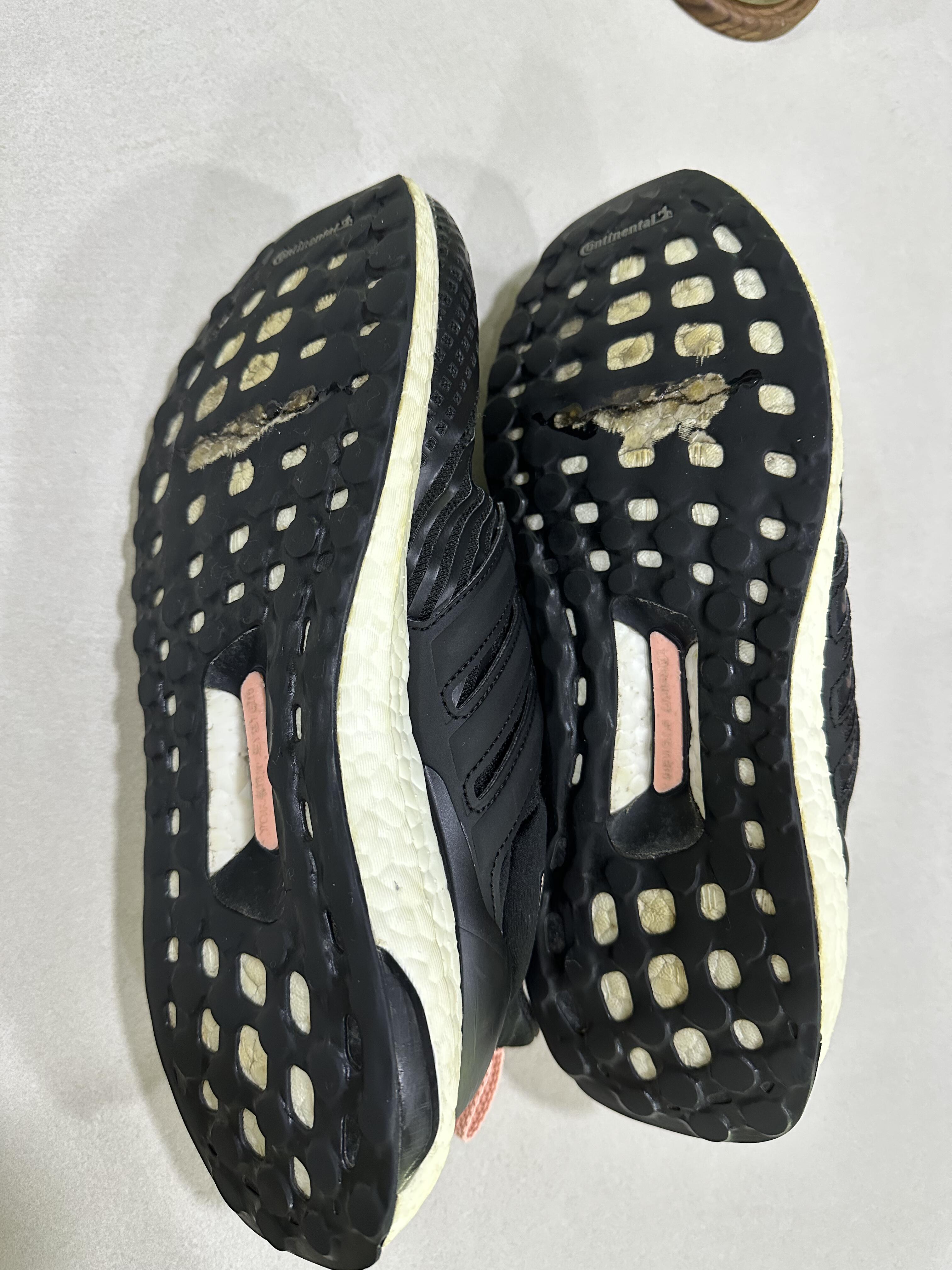 아디다스 울트라 부스트의 상태. 밑창이 닳다 못해 부스트가 찢어졌다.